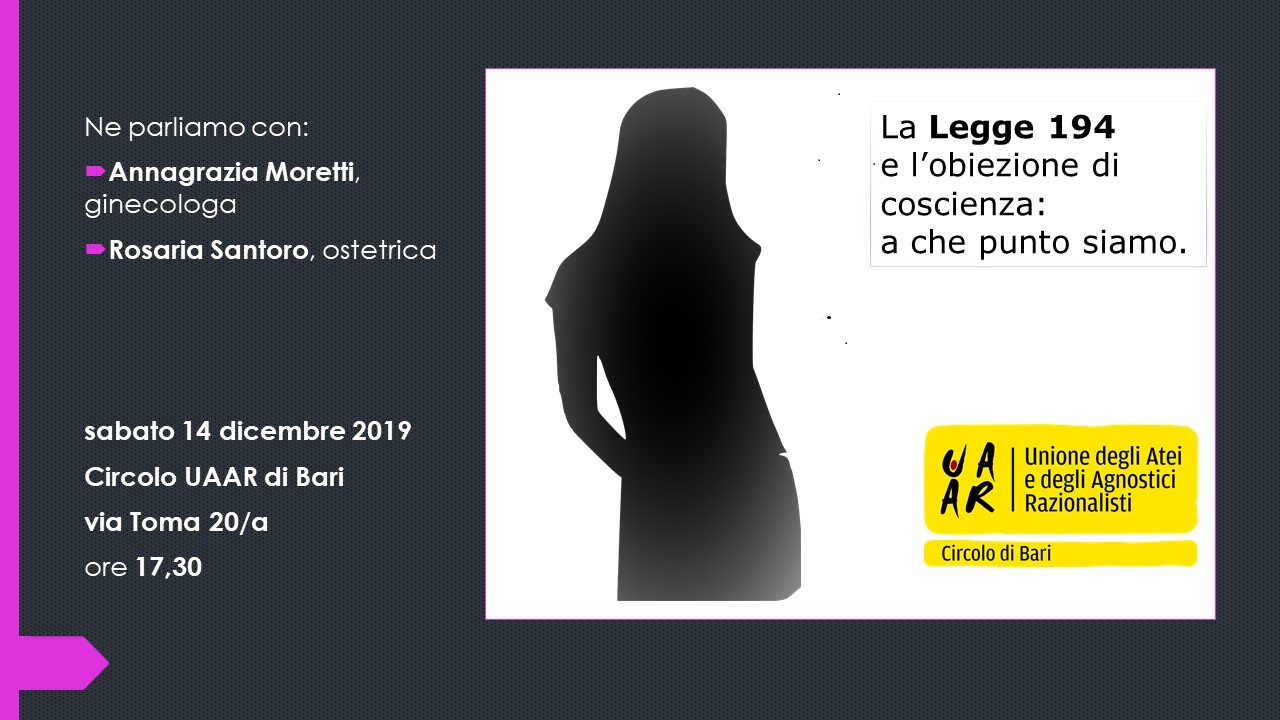 Sabato 14, alle ore 17,30, si parla di «Legge 194 e obiezione di coscienza». Insieme ad Annagrazia MORETTI, ginecologa, e a Rosaria SANTORO, ostetrica, cercheremo di capire a che punto siamo, il tanto che c’è ancora da fare e come farlo.