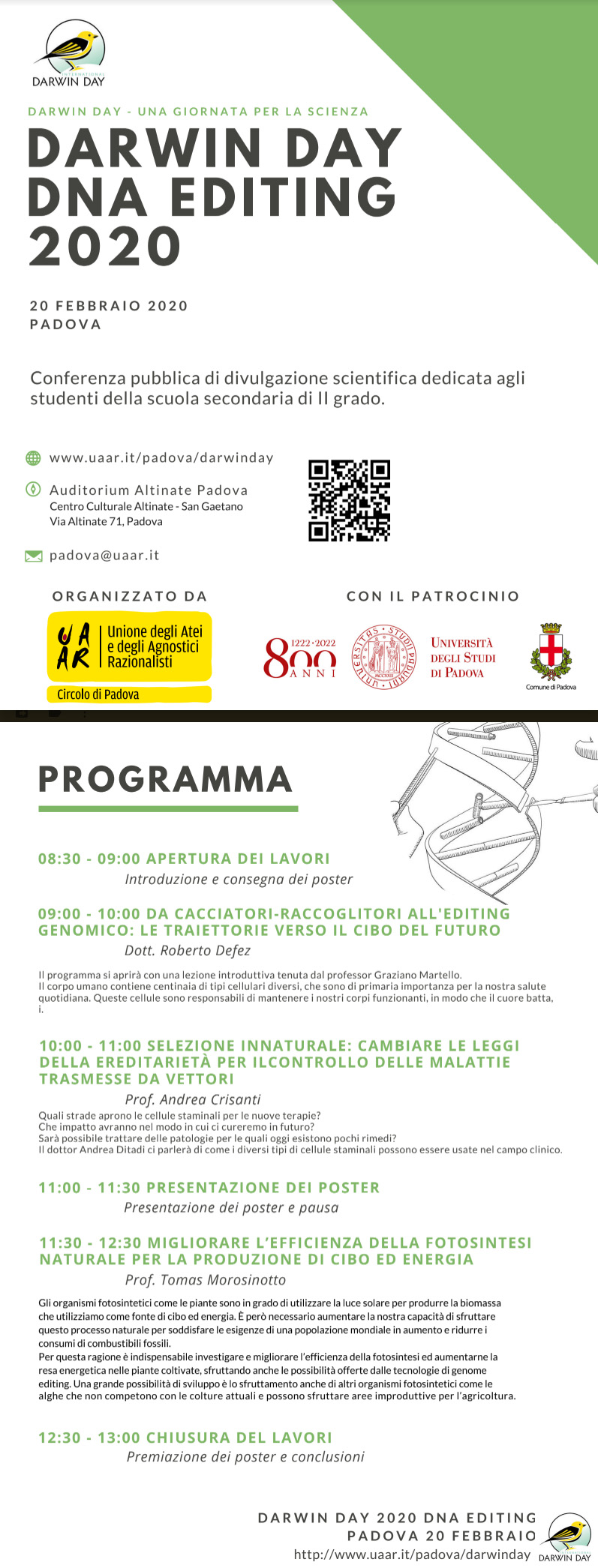 20 febbraio «Darwin Day 2020 DNA editing per le scuole» presso l’auditorium del centro culturale Altinate dalle ore 8:30 alle ore 13:30