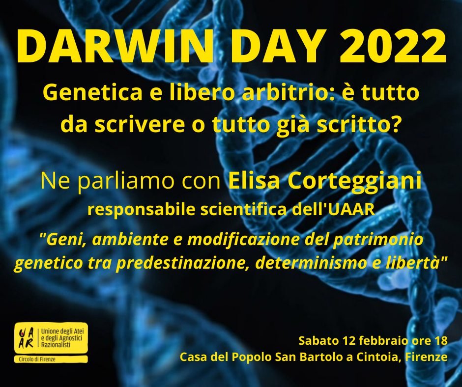 In occasione del Darwin Day 2022 Elisa Corteggiani, responsabile scientifica dell’UAAR, ci presenta un incontro dal titolo «Geni, ambiente e modificazione del patrimonio genetico tra predestinazione, determinismo e libertà». L’evento è organizzato con la collaborazione degli altri circoli toscani UAAR Lucca, UAAR Livorno, UAAR Pisa, UAAR Siena».