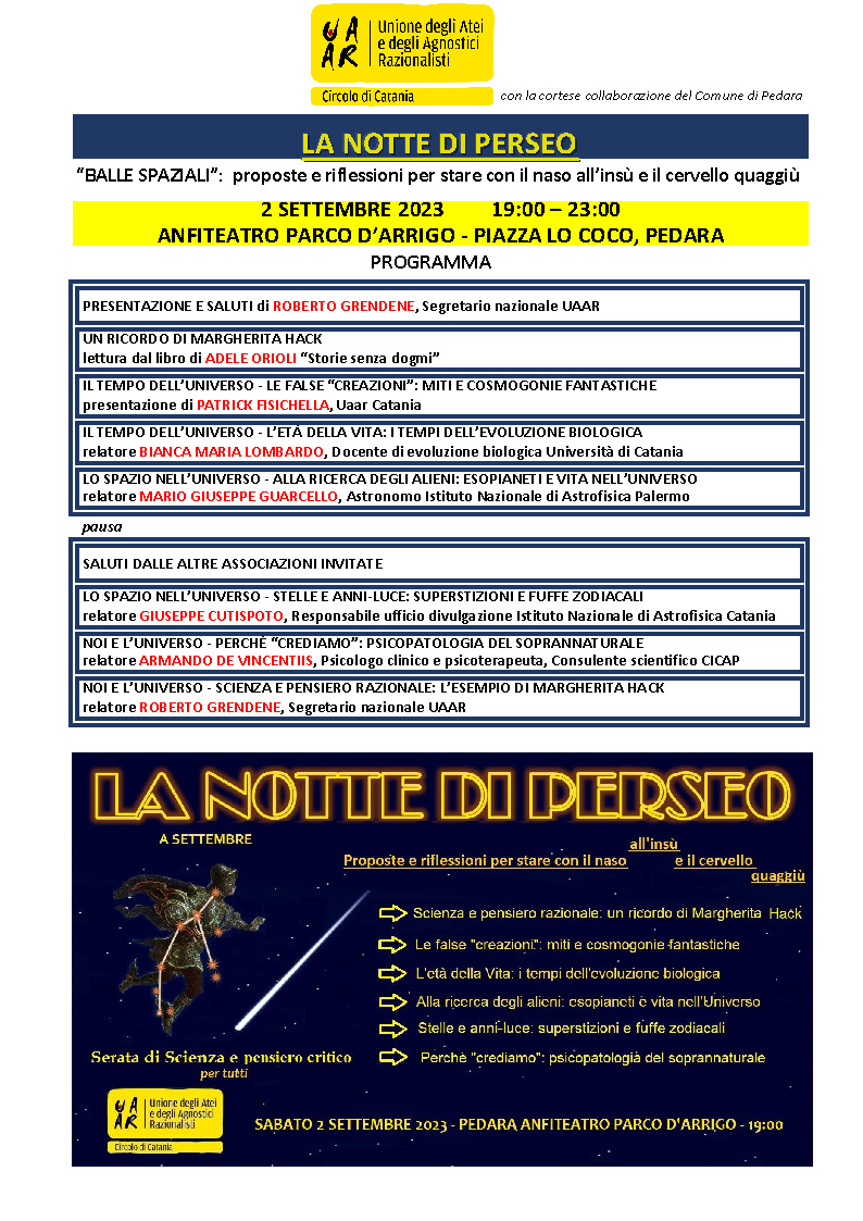 Il Circolo UAAR di Catania organizza un evento pubblico, aperto a tutti, di intrattenimento e divulgazione scientifica. Si terrà a Pedara, alle pendici dell’Etna, il 2 Settembre 2023, dalle ore 19.00 alle ore 23.00. Il luogo concesso gentilmente dal Comune ospitante è l’anfiteatro del parco D’Arrigo, con ingresso da Piazza Lo Coco.