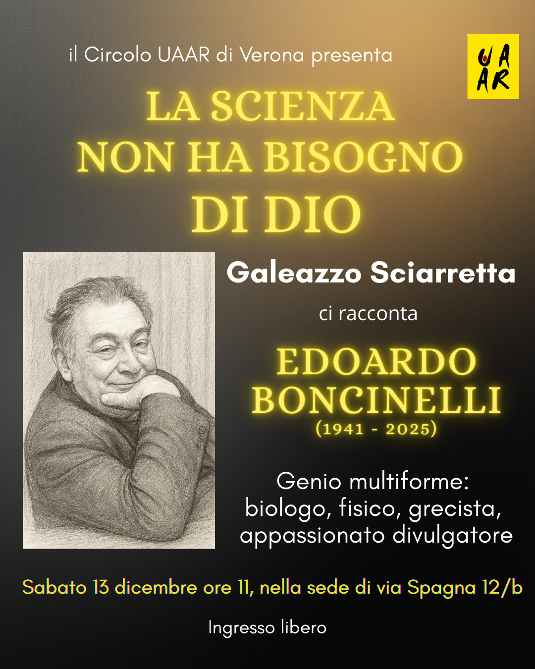 «la scienza non ha bisogno di Dio», è la conclusione cui è arrivato uno degli scienziati contemporanei più poliedrici: fisico, biologo, fecondo e lucido comunicatore, esponente di punta del pensiero laico: Edoardo Boncinelli.